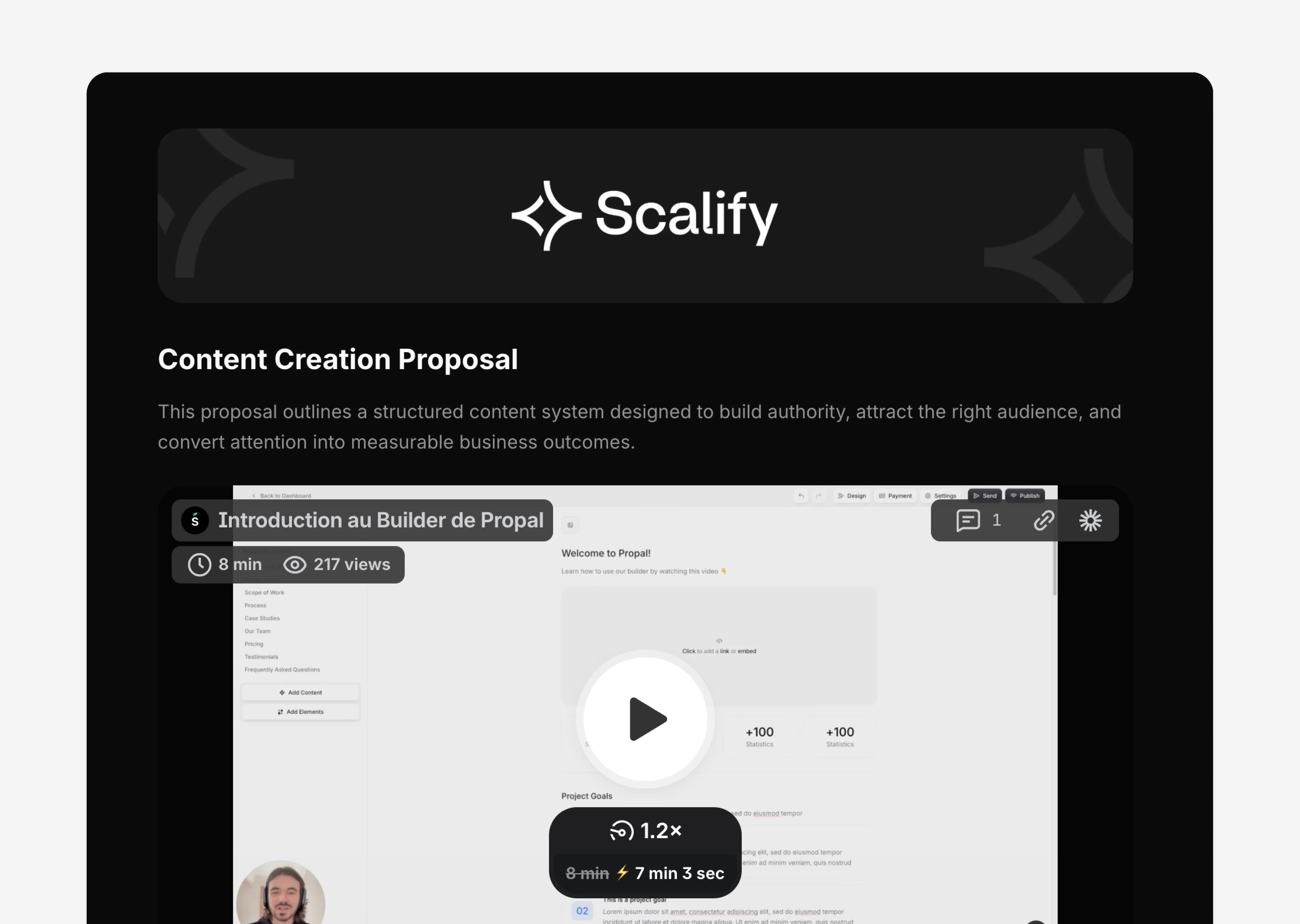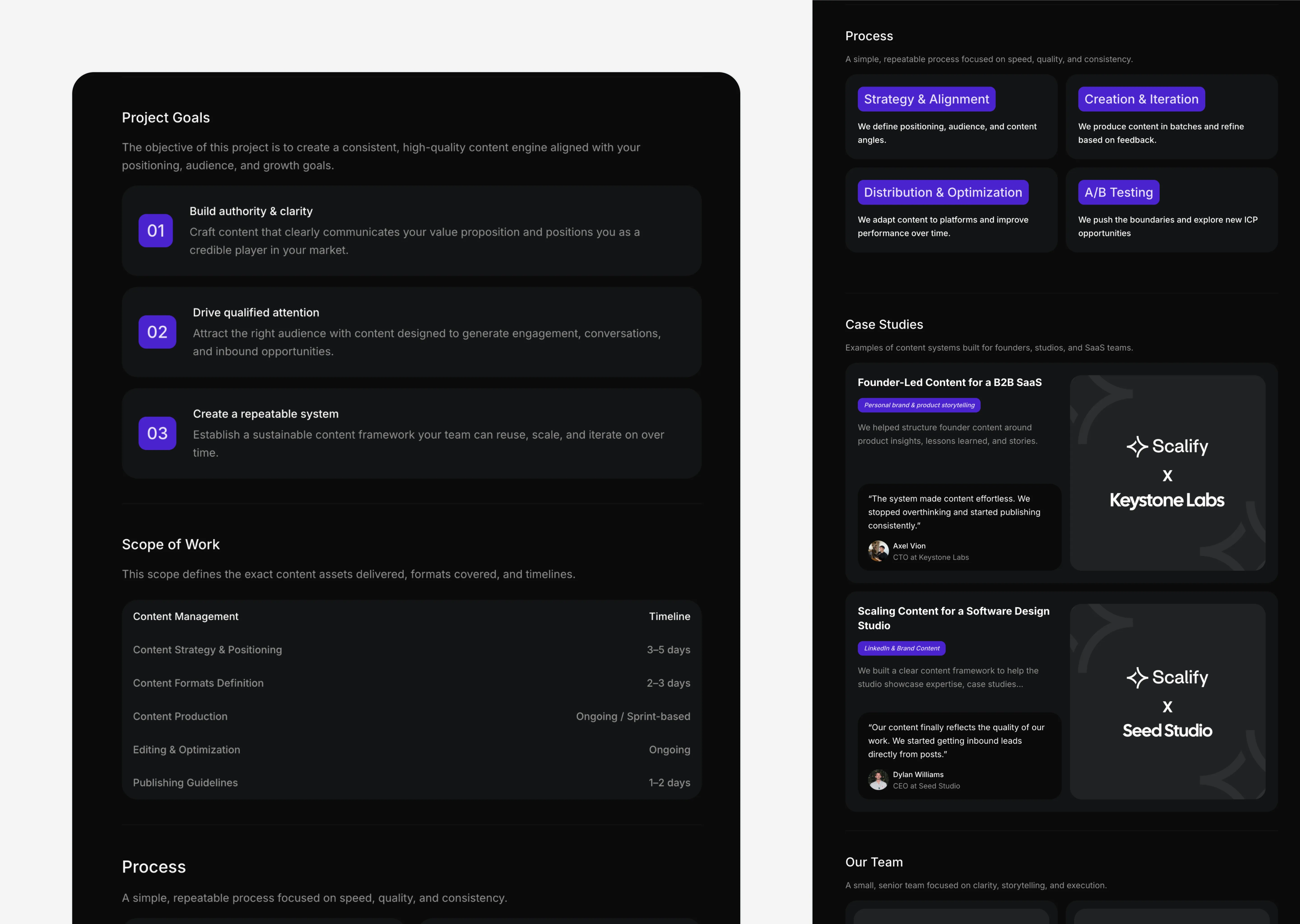Showcases content strategy, production volume, and expected outcomes in a simple, scalable format.